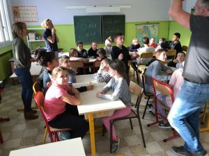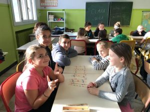 Sur la photo, nous sommes dans la salle 2 et il y a M.Vouillot venu avec sa classe d’ULIS pour jouer au jeux des allumettes en équipe avec les CE1 au jeu des allumettes contre les 6ème. Emma, Emma, Lindsay, Tom, Lucas