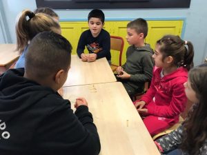 Nous avons appris aux élèves du CE1 et aux élèves d’ Ulis le jeu des allumettes. Nous avons fait des groupes de 3 ou 4 élèves.