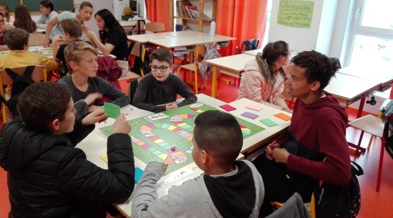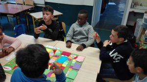 On est allés présenter le Trivial Pursuit que les 4èmeG et les Ulis ont créé l’année dernière, aux élèves de CM1 et CM2 de deux écoles. On leur a expliqué les règles et on les a fait jouer.