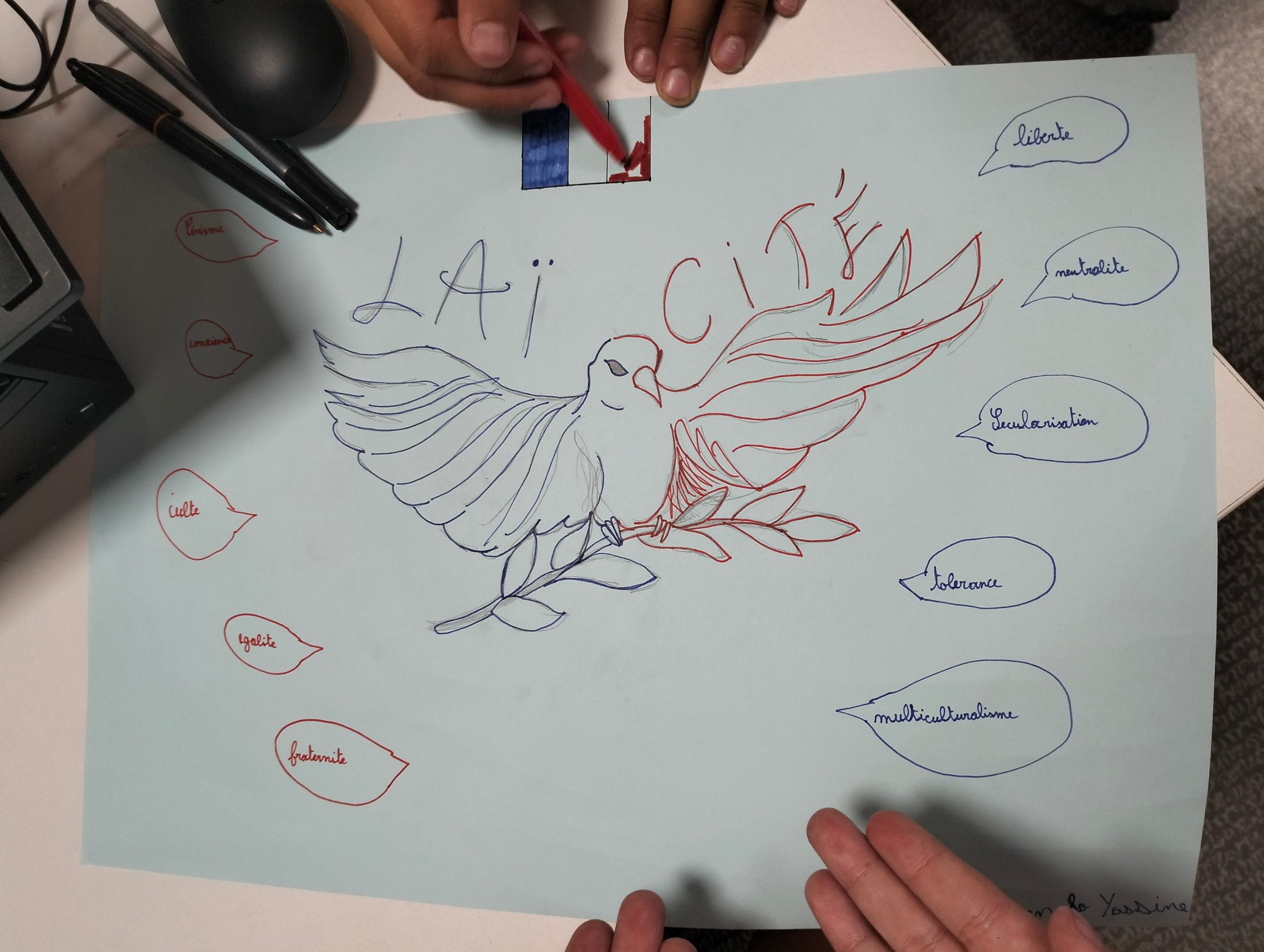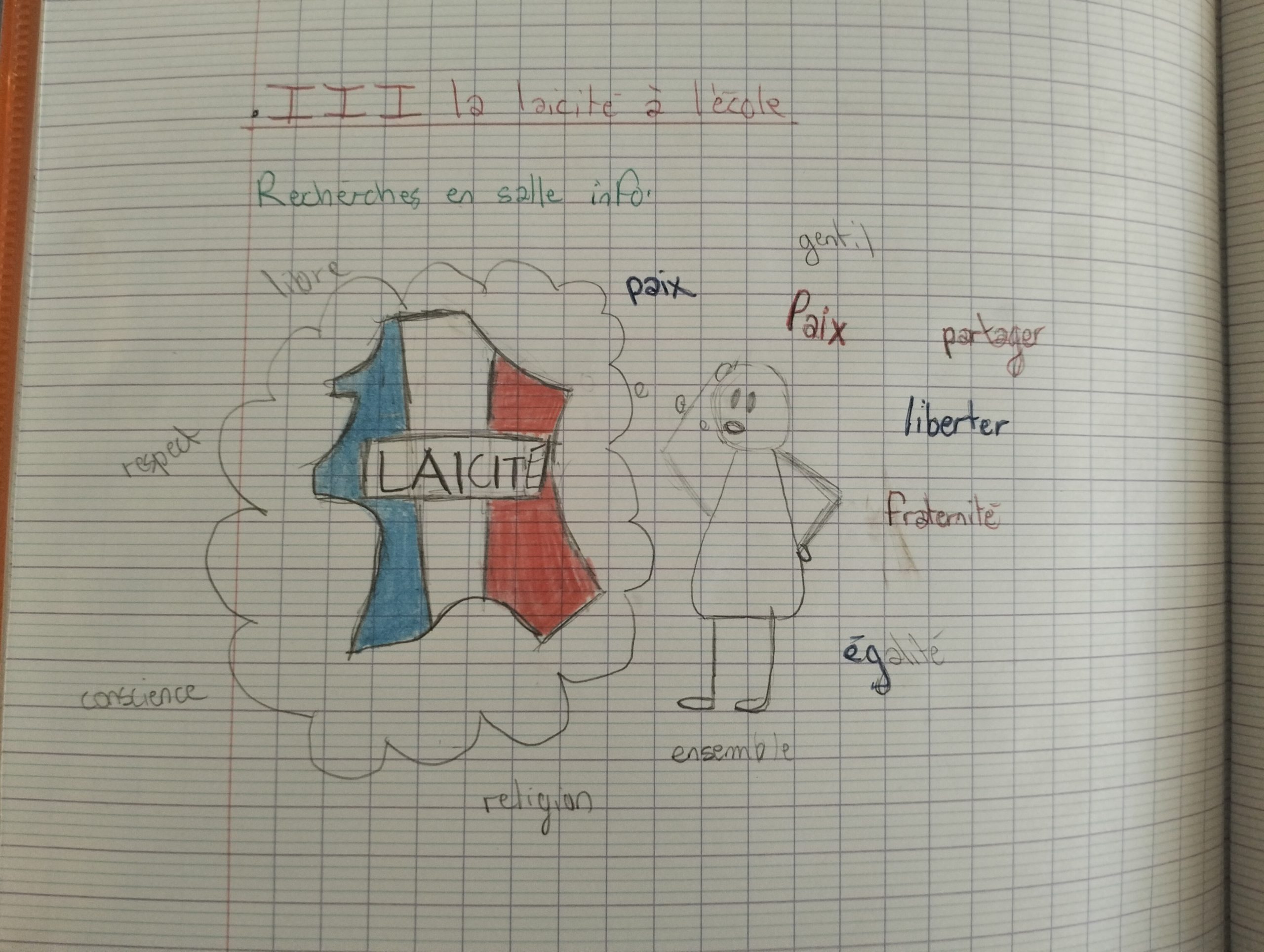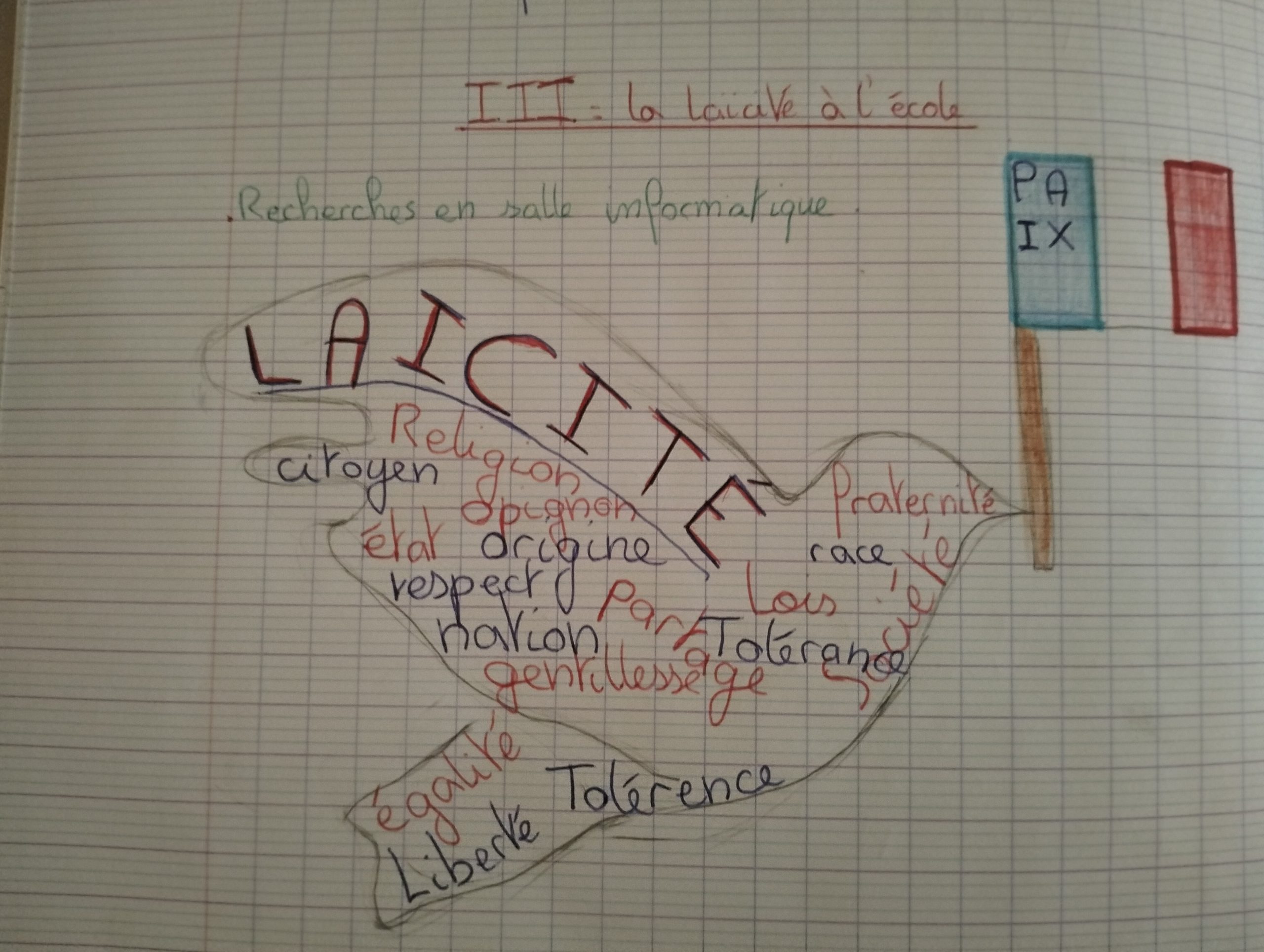 Les élèves de 6èmeA, 6èmeC, 6ème F ont réalisé un travail de recherches et de créations artistiques sur la notion de laïcité dans le cadre du cours d’EMC avec leur professeure d’histoire-Géographie Madame Ruf et la professeure documentaliste Madame Cendo.