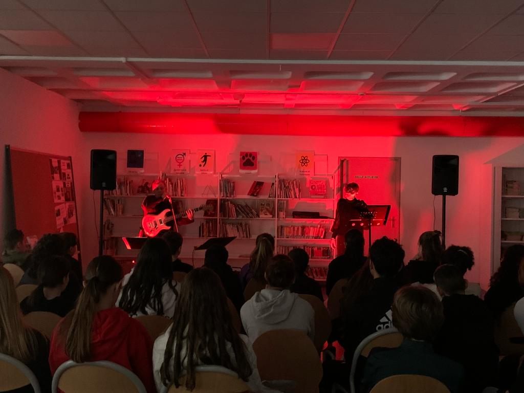 La compagnie montargoise au nom rimbaldien « Je est un autre » est venue ce vendredi 9 février au Collège Roger Carlès devant deux classes de 4ème afin de mettre en scène et en musique des oeuvres de la littérature fantastique. Les poèmes baudelairiens de « L’Horloge » et « Les métamorphoses du vampire », issus des Fleurs du Mal, ont encadré la mise en voix du Masque de La Mort Rouge, une nouvelle d’Edgar Allan Poe.