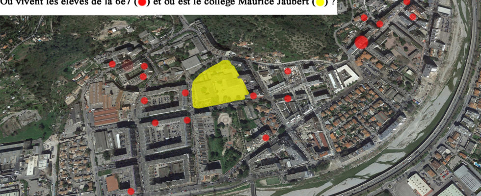Habiter, c’est d’abord (mais pas seulement) résider. Et donc, sur une vue satellite, on a placé des pastilles pour montrer où résident les élèves. A l’Ariane d’accord … mais plutôt du côté de Saint Jo’ ? des Heures Claires ?