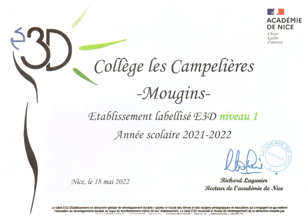 - Valorisation de nos actions Labellisation E3D par le Rectorat – Académie de Nice Niveau II
