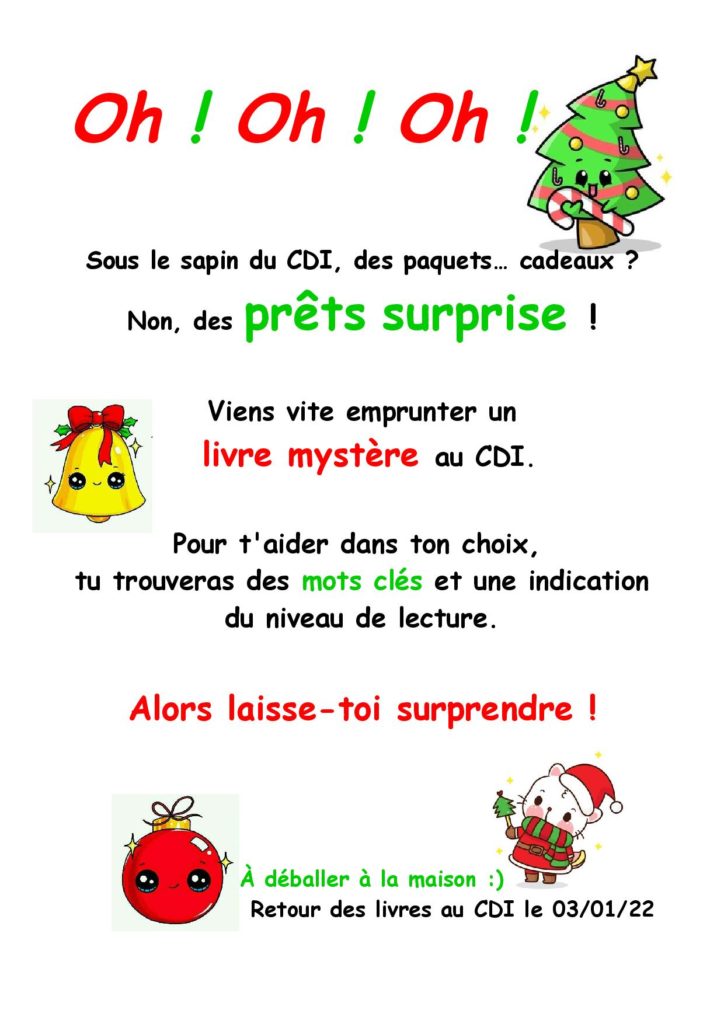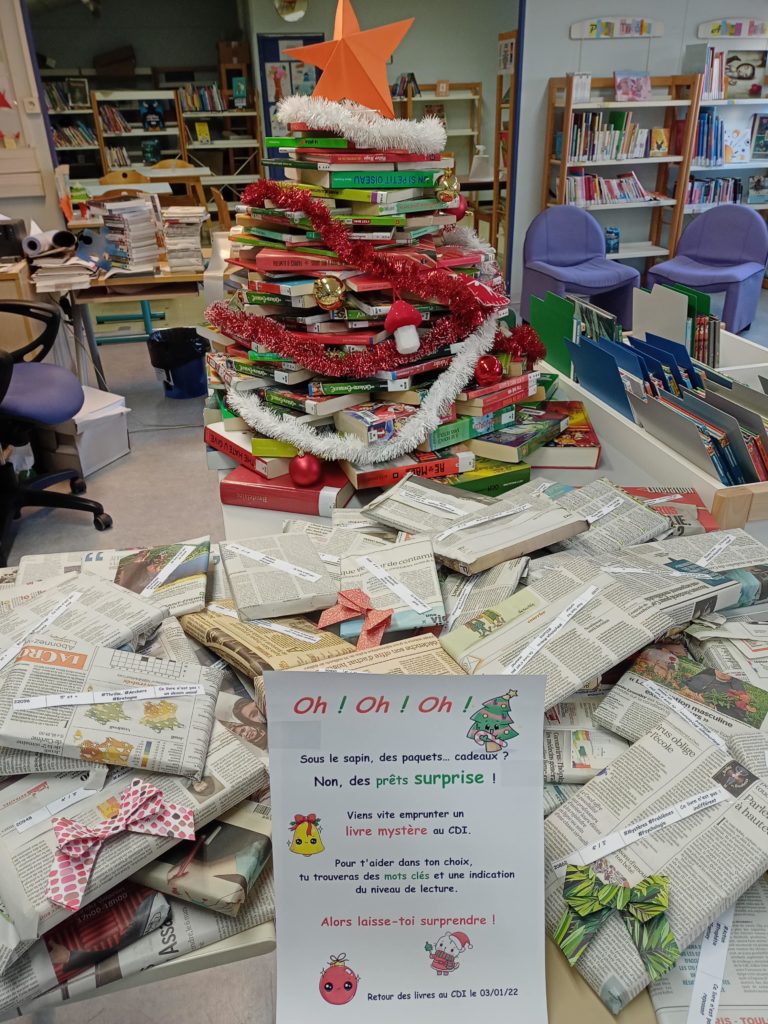 Et grâce à l’aide de plusieurs élèves de 6e, nous proposons cette année des prêts surprise ! Les élèves peuvent emprunter un livre mystère jusqu’au 16/12, le lire pendant les vacances et le rapporter au CDI le lundi de la rentrée.