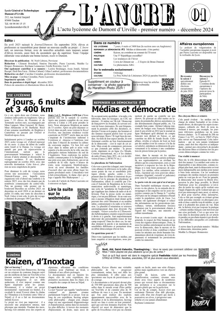 En avril 2023 naissait le Journal2Dumont. En septembre 2024, élèves et professeurs se rassemblent pour donner un nouveau souffle au projet : L’Ancre naît, un nouveau format, avec de nouvelles actualités mais toujours autant d’élèves investis, aussi bien du secondaire que du supérieur. Deux numéros sont parus à ce jour :