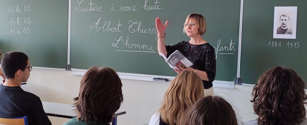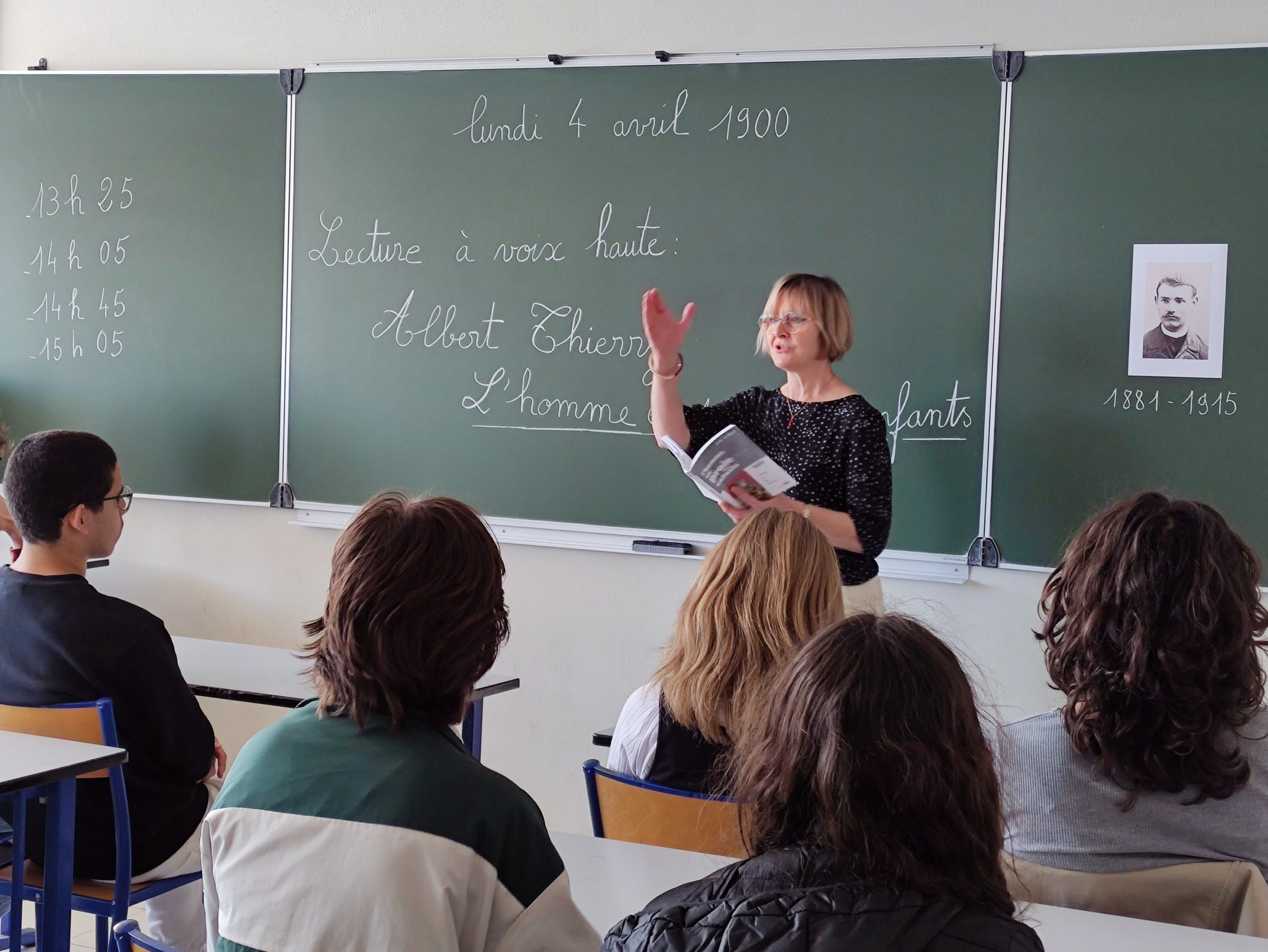 Parmi les performeurs du festival A Voix Haute, il y avait un visage que vous avez peut-être déjà croisé au détour d’un couloir ou devant un tableau blanc : celui de madame Pascale Pous qui enseigne la philosophie au lycée. Depuis la première édition du festival en 2021, elle profite de l’occasion pour transmettre des textes qui la touchent. Cette année, elle a choisi de partager les mots d’Albert Thierry, un jeune enseignant du début du XX°siècle qui a publié en 1909 L’homme en proie aux enfants, un recueil dans lequel il fait part de ses observations et réflexions. Nous avons interrogé Madame Pous entre deux représentations.