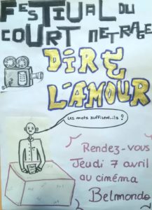 Lili et Ben sont venus nous aider à réaliser ce projet. Ils nous ont sélectionné 12 courts-métrages autour du thème de l’amour avec pour problématique : « Les mots suffisent-ils ? ». Suite à ce visionnage, nous devions en retenir 6 afin de les présenter pendant la semaine du court-métrage à d’autres élèves.