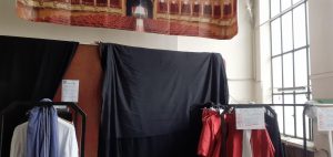 Puis nous sommes allés dans une loge où sont entreposés les costumes, où se changent et répètent les artistes. On a remarqué que dans cette salle il y avait beaucoup de costumes différents et un immense rideau sur une pièce de bois qui sert à s’habiller ou à se déshabiller.