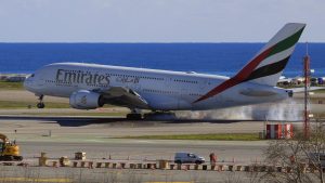 Airbus A380 de la compagnie Emirates au toucher sur la piste de l’aéroport de Nice (source : Quentin Farrugia)