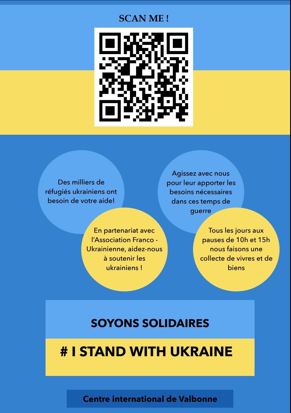 A l’initiative de plusieurs élèves lycéennes, un collecte est organisée en collaboration avec l’Association Franco-Ukrainienne en PACA. Vos dons de vivres et de biens peuvent être déposés au stand qui se tient près de la MDL jusqu’à mercredi prochain 9 mars.
