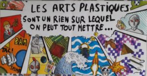 L’entrée du collège n’est plus tout à fait la même, depuis une quinzaine de jours des œuvres s’exposent sur les baies vitrées du bâtiment C. Il s’agit de travaux réalisés en Arts plastiques, sur une proposition de Mme Frossard. Le point de départ de ce travail, une interrogation : « Pour moi, c’est quoi les Arts plastiques ?« .