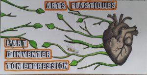 L’entrée du collège n’est plus tout à fait la même, depuis une quinzaine de jours des œuvres s’exposent sur les baies vitrées du bâtiment C. Il s’agit de travaux réalisés en Arts plastiques, sur une proposition de Mme Frossard. Le point de départ de ce travail, une interrogation : « Pour moi, c’est quoi les Arts plastiques ?« .