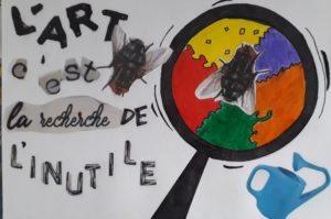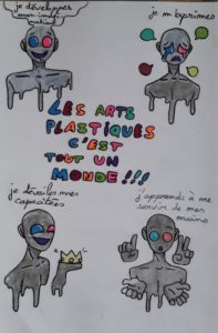 Mme Frossard a souhaité accompagner les élèves dans un projet commun dès la rentrée. Comme une réponse à la situation sanitaire actuelle qui nous éloigne les uns des autres. Cette expo nous rappelle l’évidence de l’éducation artistique !