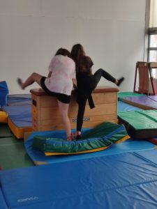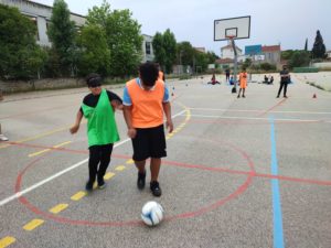 Pour la deuxième activité il faut mettre le ballon derrière des tapis avec les yeux bandés, c’est un jeu collectif guidé par la voix de quelques élèves et par le son du ballon à grelots.