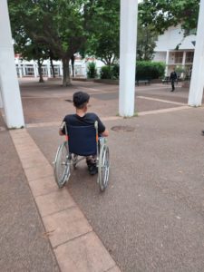 La troisième activité du menu permet la découverte du handicap moteur comme par exemple celui d’une personne paraplégique. Il faut faire le tour de la cour avec un siège à une roue soutenu par deux personnes. Puis le parcours en fauteuil roulant des salles de maths à la cantine.