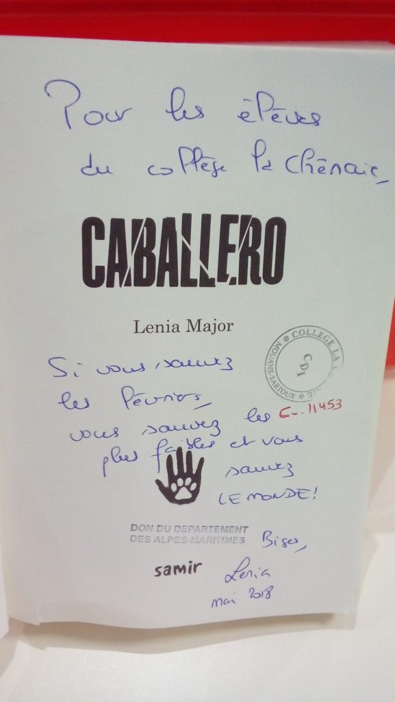 A la fin de l’année, les élèves ont pu rencontrer les auteurs et assister à des spectacles lors d’une grande journée de fête. C’est l’auteur du roman Caballero, Lénia Major, qui a gagné le Prix Paul Langevin et nous étions tous ravis! En plus, elle nous a dédicacé un exemplaire pour le CDI.