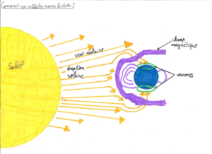 Une aurore boréale c’est une lumière dans le ciel qui est due à l’interaction entre les particules chargées du vent solaire et la haute atmosphère.
