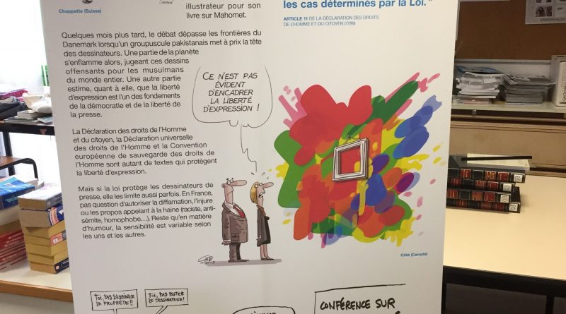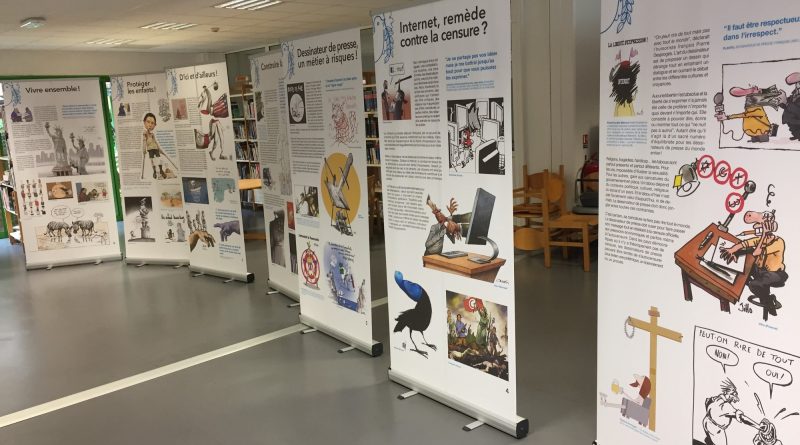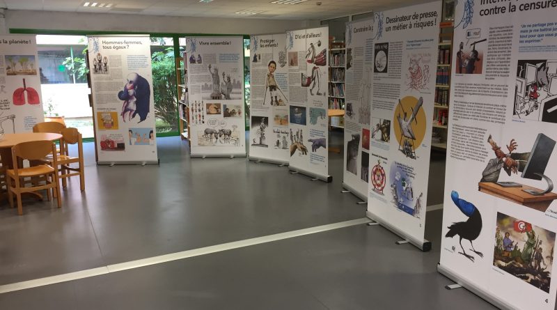Cartooning for peace est un « réseau international de dessinateurs de presse engagés qui combattent, avec humour, pour le respect des cultures et des libertés ». L’exposition se compose de onze panneaux illustrant le combat pour la liberté d’expression et le travail des dessinateurs.