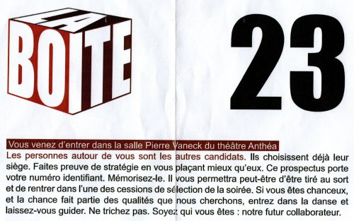 Dès notre entrée dans la salle, nous avons reçu des numéros pour nous faire croire que n’importe quel spectateur pouvait être tiré au sort pour participer à un Escape Game, afin d’obtenir un contrat de travail. Nous avons découvert que les trois acteurs étaient assis dans le public. Une fois « choisis », ils se sont rendus sur scène. Ils ont dû faire face à de nombreuses épreuves. Au fil de ces dernières, les candidats se sont montrés plus en plus violents. Finalement, ils se sont entretués et il n’en est resté plus qu’un qui a obtenu un emploi dans la boîte…