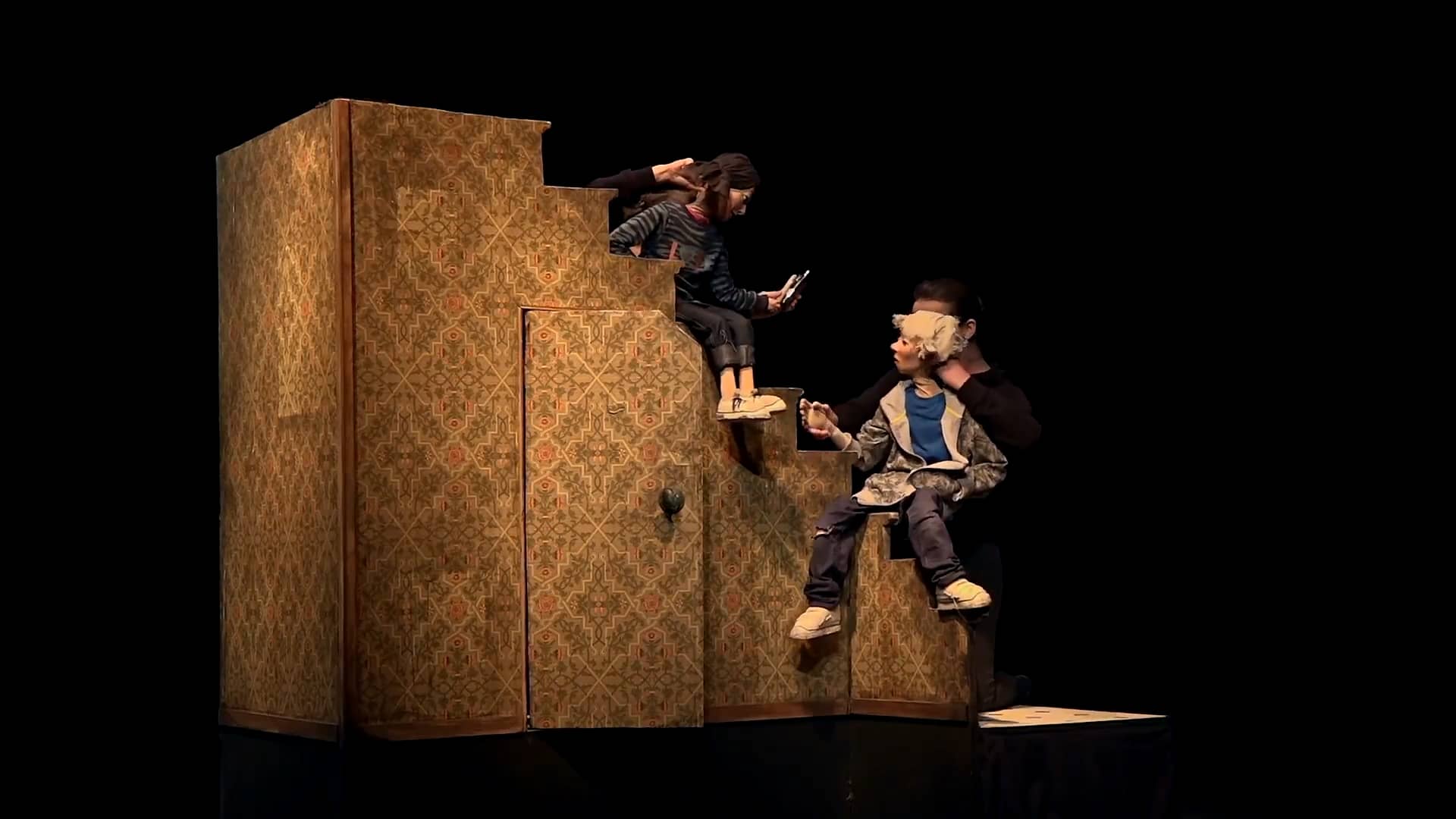 Comme décor, un escalier et son débarras. Tout autour, des enfants représentés par des marionnettes… Sous cet escalier, plusieurs générations d’enfants vont se succéder, intégrant ce débarras pour fuir, se cacher ou jouer. Les époques changent mais ce lieu fermé devient finalement le territoire de chacun, ce chacun retrouvant souvent une trace de ceux qui l’ont précédé. Dans le placard, sous l’escalier, le temps passe, les enfances se succèdent. Des années les séparent, pourtant leurs jeux se ressemblent. Leurs époques diffèrent, mais leurs émotions se ressemblent. Leurs modes de vie évoluent, mais leurs aspirations se ressemblent. Chaque enfant est unique et pourtant chaque enfant se ressemble. Le spectateur est le témoin privilégié de leurs moments de complicité, de secrets partagés, d’interdits transgressés.