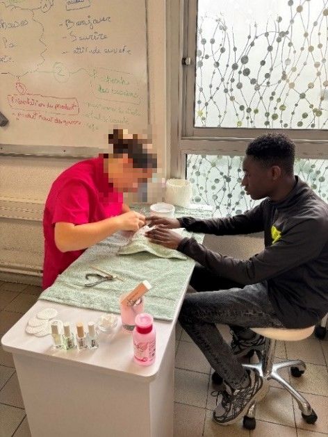 Les garçons de la classe en retour ont bénéficié de soins des mains et de soins du visage, qui se sont révélés très agréables, confortables et apaisants. Leur professeur, Mme Viola, nous a expliqué comment prendre soin de notre corps, notamment de la peau, du visage et des mains, en utilisant les crèmes appropriées pour hydrater et protéger la peau. Elle nous a également présenté le contenu de leur formation ainsi que les règles d’hygiène à respecter.