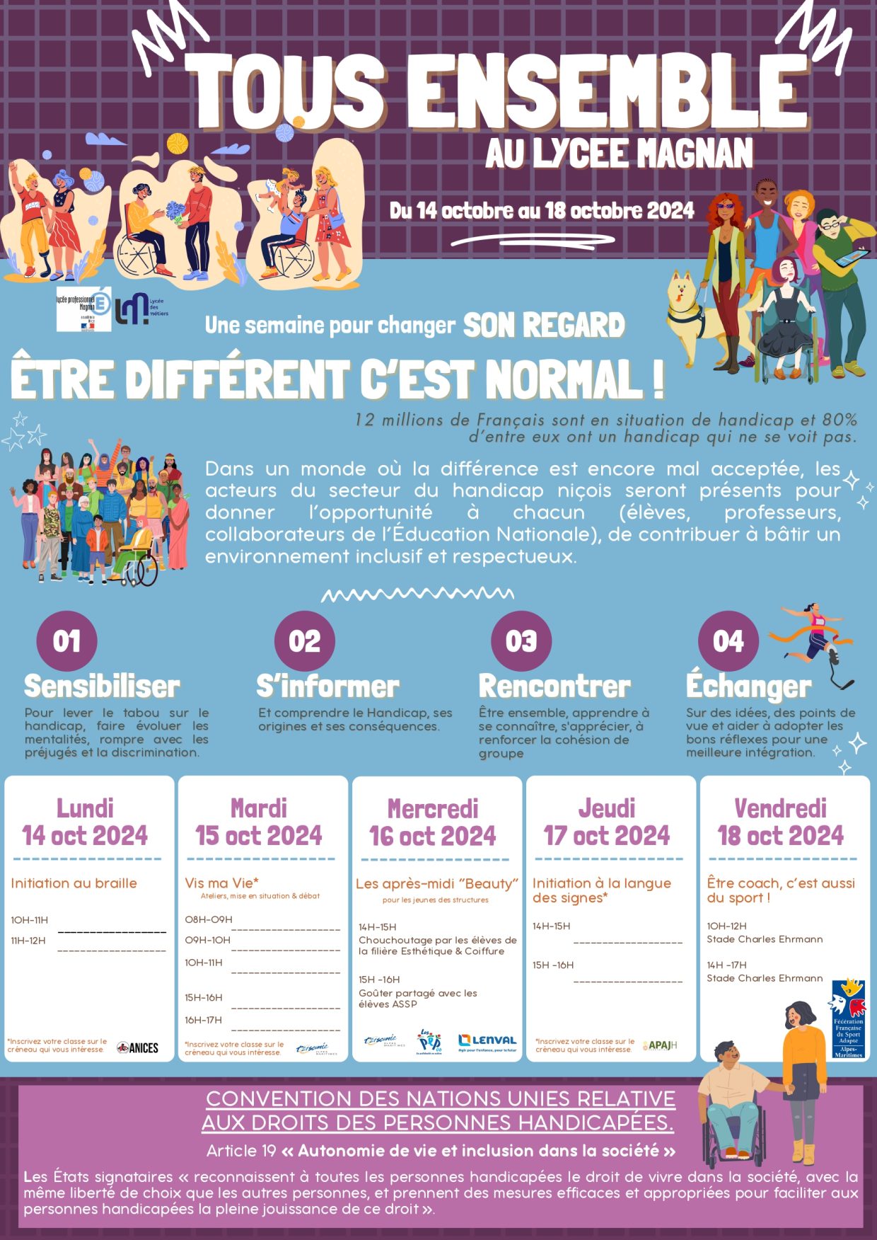 Du 14 octobre au 18 octobre 2024, une semaine « Tous ensemble » a été organisée par Mme Coiffier du Bureau des Entreprises afin de changer son regard sur le handicap.