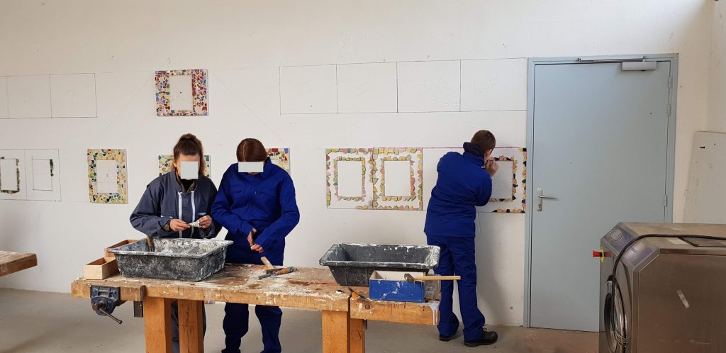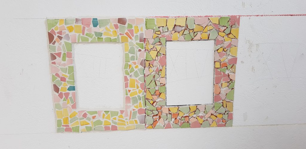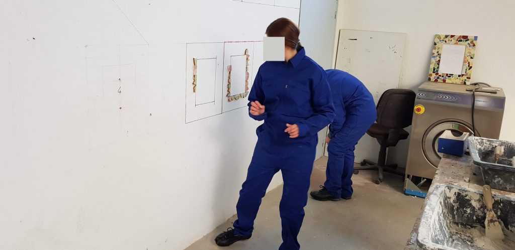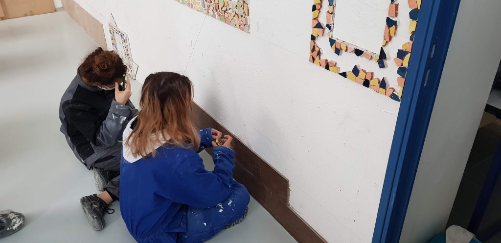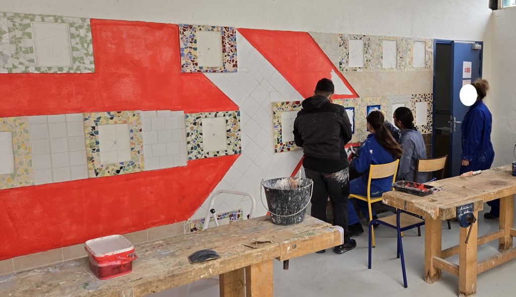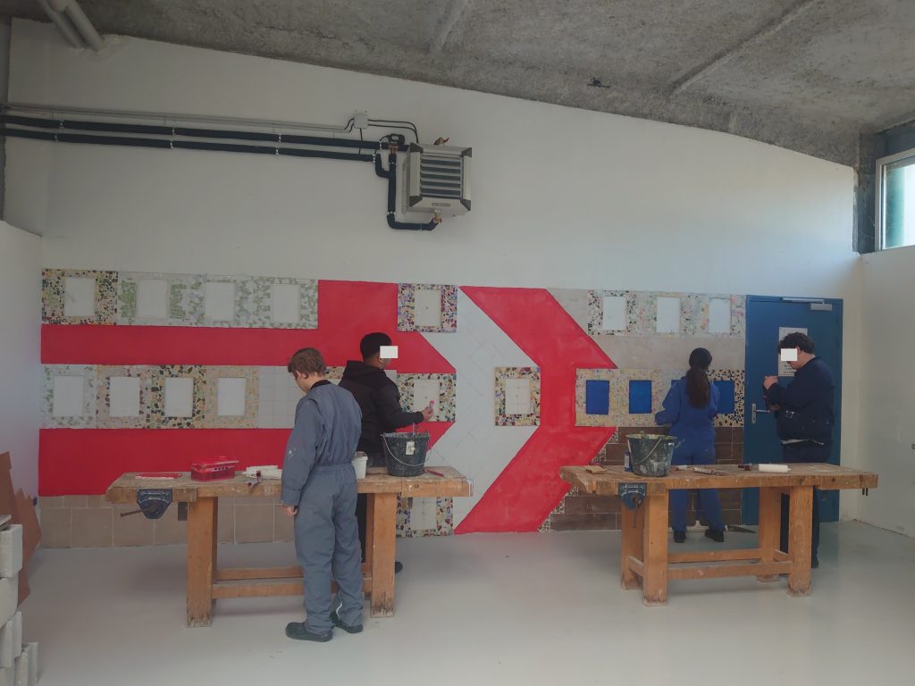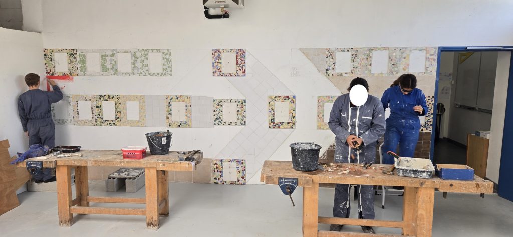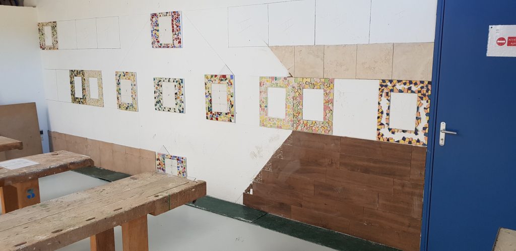 Un mur de notre plateau technique a été recouvert de carrelage, de mosaïque et de peinture. Il servira de support à usage informatif.