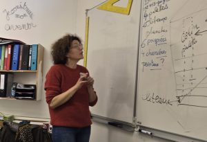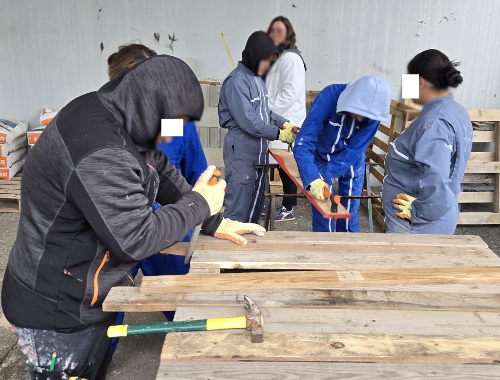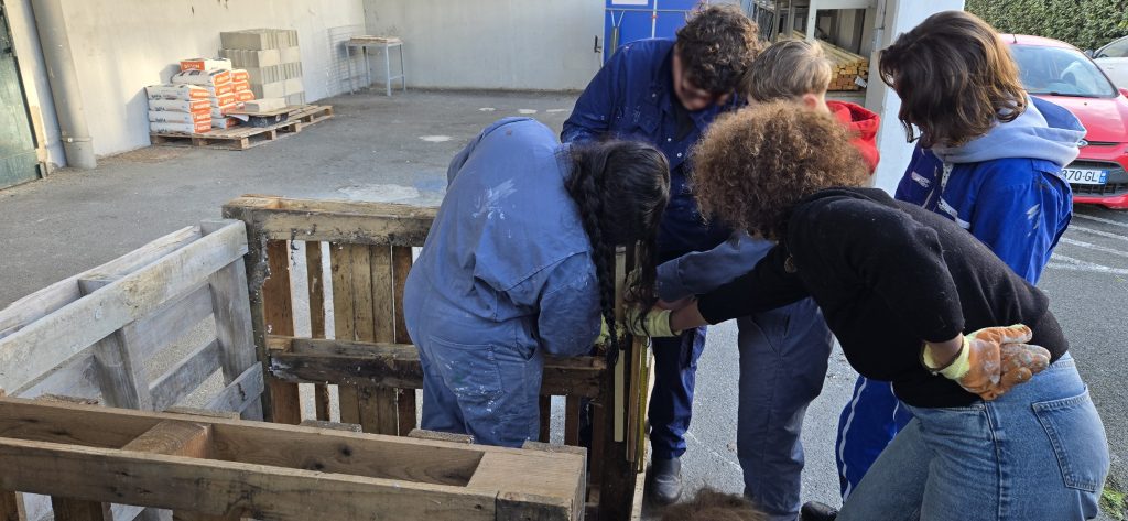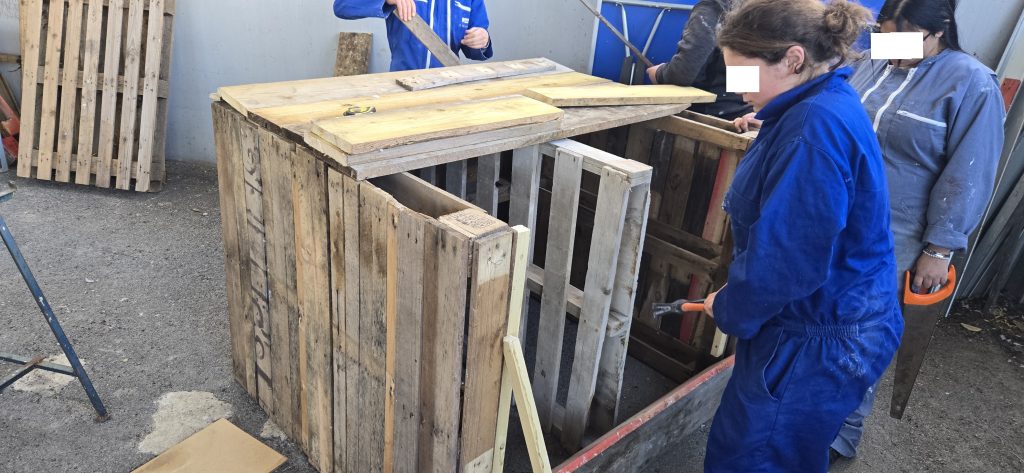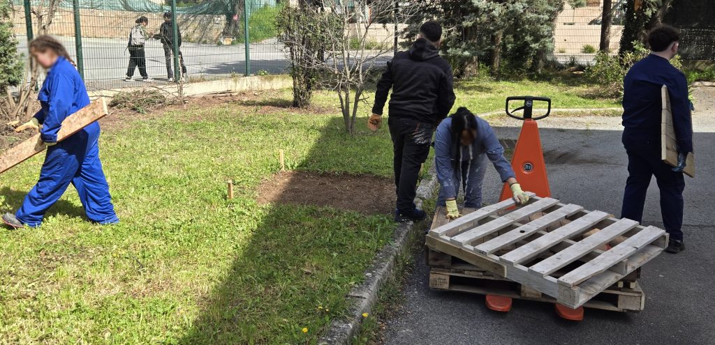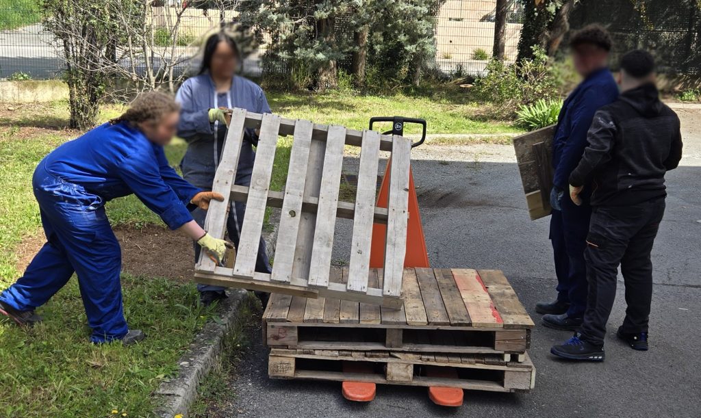 Après avoir démonté le bac à compostage, nous amenons les éléments sur les lieux de sa mise en place !