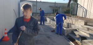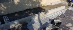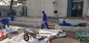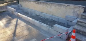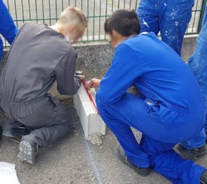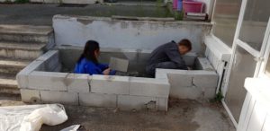 Les élèves utilisent la massette et le niveau à bulle pour régler les parpaings en extrémité de la jardinière.