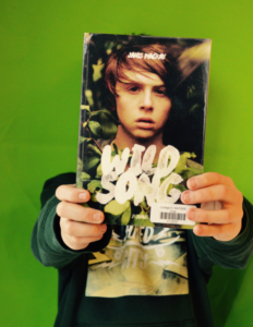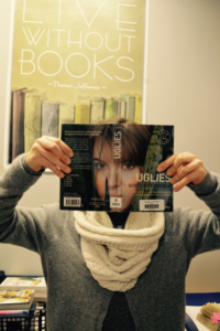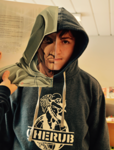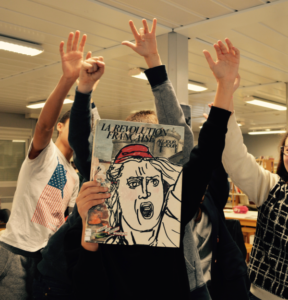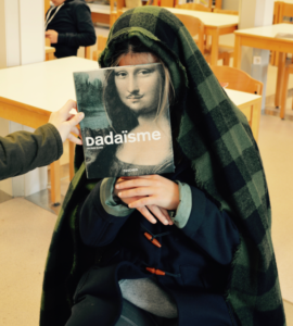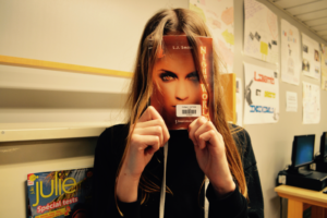 Série de photographies de type « bookface » par des élèves de cinquième : des portraits intégrant des couvertures de livres ou périodiques qu’ils ont choisis parmi les collections du CDI.