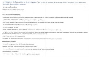 Les nombreuses contraintes liées à la restauration avaient alors été présentées aux élèves. Par exemple, les produits doivent être frais, la chaine du froid doit être respectée, les menus doivent être variés et équilibrés.