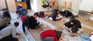 Quand nous sommes entrés dans la salle, nous avons découvert 3 longues rangées de photogrammes posés au sol : 124 feuilles format A4, décomposant image par image la séquence finale du film Les 400 coups, lorsqu’Antoine Doinel, échappé du centre de redressement pour mineurs, court vers la mer. Chacun de nous a eu 6 images recouvertes de papiers calques et a reçu pour consigne de redessiner la silhouette du personnage pour proposer sa propre version. Feuilles, stylos, pastels : chacun a pu utiliser la technique qui lui convenait.