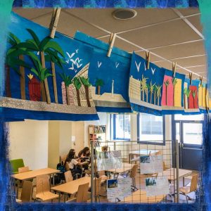 Au milieu des présentoirs de livres, accrochés sur un fil par des pinces à linge, les travaux d’arts plastiques des élèves s’affichent au CDI façon Grande Lessive.
