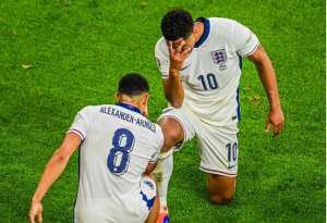 La célébration de Jude Bellingham, qui joue au Réal Madrid, est de mettre un genou au sol, le coude posé dessus et la main sur le visage. C’est une référence au jeu du «Loup-garou», un jeu de carte pratiqué par son équipe. Il fait ce geste avec son coéquipier le plus fidèle, Trent Alexander-Armold.