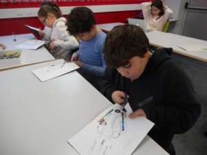 Comme il pleuvait beaucoup, notre premier travail s’est fait en intérieur. Nous nous sommes séparés en deux ateliers.