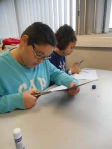 Dans un des ateliers, nous avons construit un spectroscope avec un CD. Nous avons d’abord découpé le patron puis inséré le CD qui est un moyen de disperser la lumière.