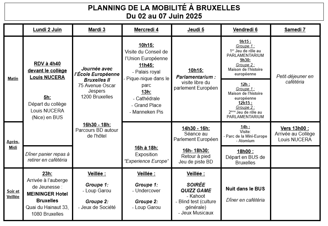 Voici le planning prévisionnel du séjour à Bruxelles