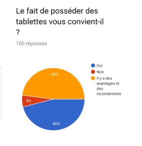 Il en ait ressorti 2 résultats flagrants, en effet, presque la moitié des élèves (46 %) en sont ravis, mais, pour la majeur partie d’entre eux (48 %), leur avis sur la question est mitigé. Notons tout de même que seulement 6 élèves sur 100 ne sont absolument pas satisfaits des tablettes, ce qui est relativement faible.