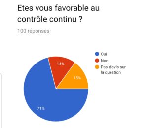 Ayant posé une question concernant la mise en place du contrôle continu, on constate que 71 % y sont favorables, pour seulement 14 % qui ne le sont pas et 15% qui n’ont pas d’avis.
