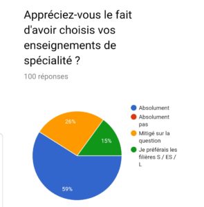 Nous avons alors pu observer que c’était le cas de 59% d’entre eux, soit environ 6 personnes sur 10. De plus, 15 % affirment préférer les anciennes filières et 26 % semblent mitigées sur la question, ce qui signifie qu’ absolument personne ne renie complètement le choix des enseignements de spécialité.