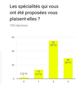 Nous leur avons ensuite demandé combien d’enseignements de spécialité parmi celles choisies plaisaient aux élèves, et la majorité, soit 55%, s’accordent sur le fait qu’une d’entre elles ne leur convient pas.