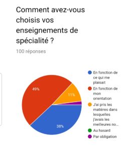 Afin de poursuivre cette enquête, il nous semblait important de savoir comment les enseignements de spécialité avaient été choisis par les élèves, et les résultats furent, encore une fois, très appréciables.