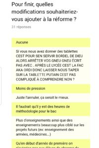 La dernière question du sondage était beaucoup plus libre, en effet, elle demandait aux élèves de définir les modifications qu’ils souhaiteraient apporter à la réforme.