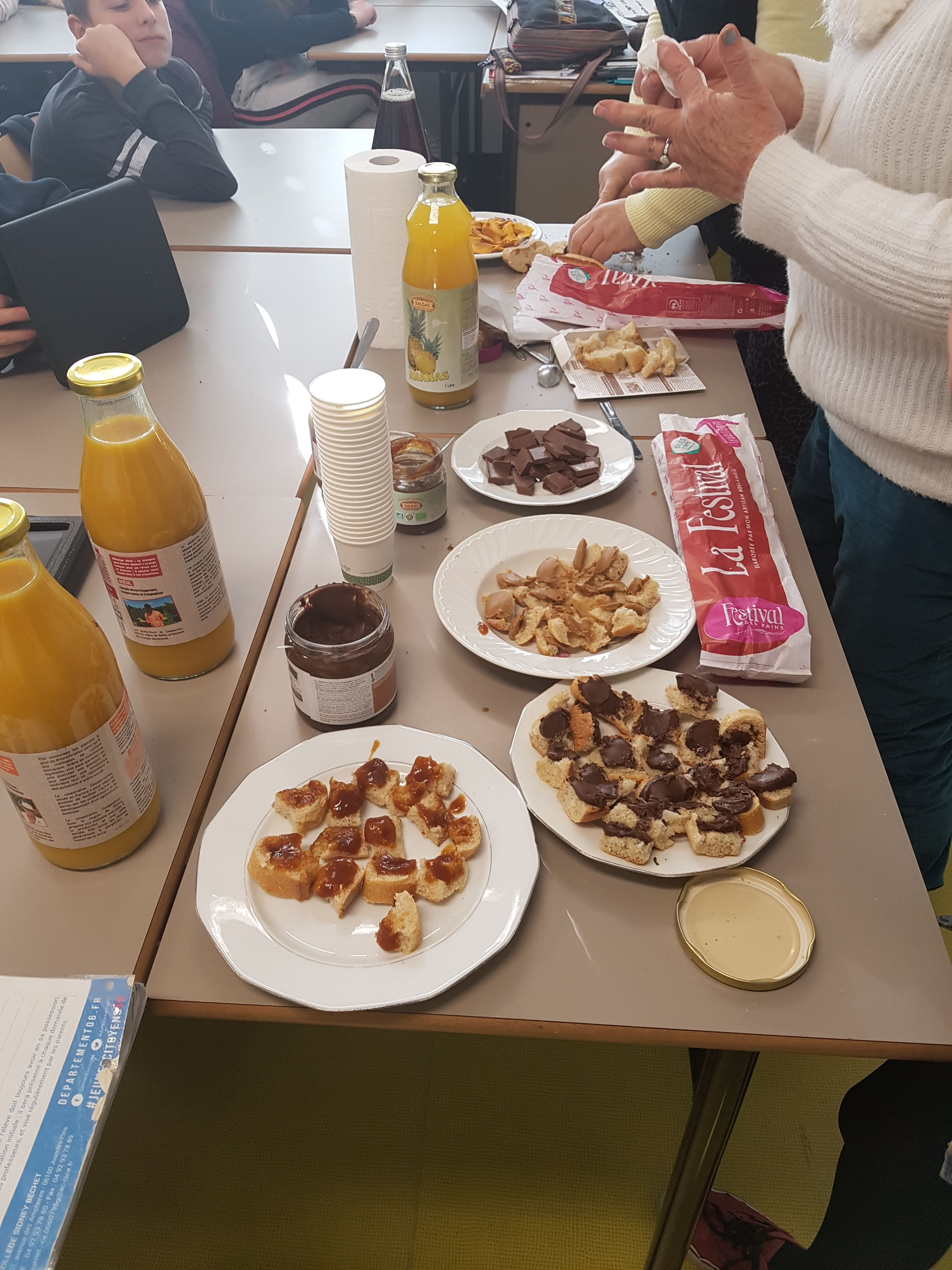Les bénévoles d’artisans du monde sont intervenus dans la classe de 5-3 du collège afin d’expliquer aux élèves ce qu’est le commerce équitable. Cette intervention s’inscrit dans le projet Développement Durable de la classe. Les bénévoles ont préparé pour la classe une dégustation équitable : jus de fruits, pate à tartiner, chocolat, mangue déshydratée, confiture. Tous les élèves se sont accordés à dire que les produits étaient délicieux.