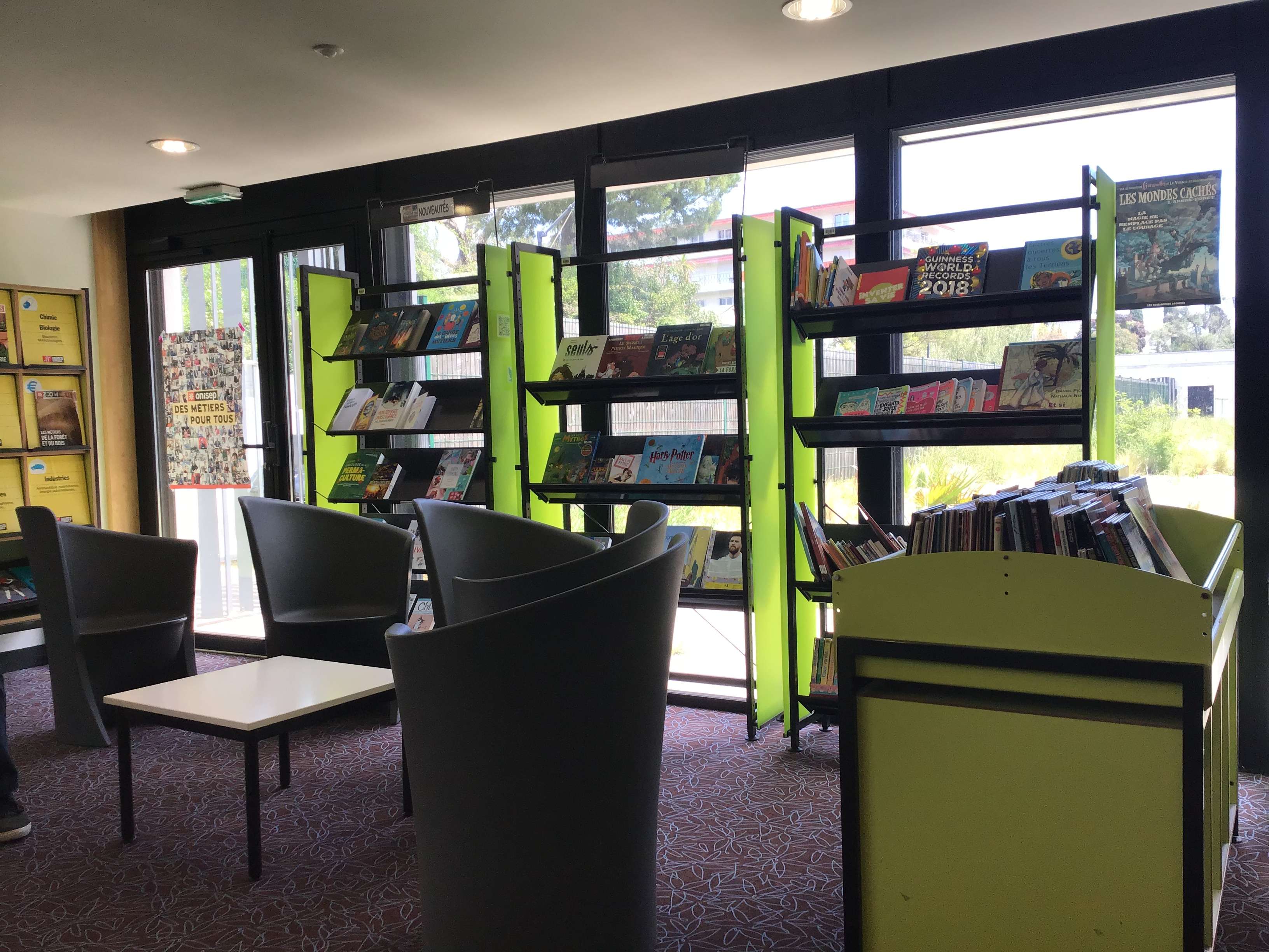 Le CDI est équipé de plusieurs rayons remplis de livres : manga BD romans, manuels, ouvrages documentaires. Il y a aussi une boite pour le troc de livres.